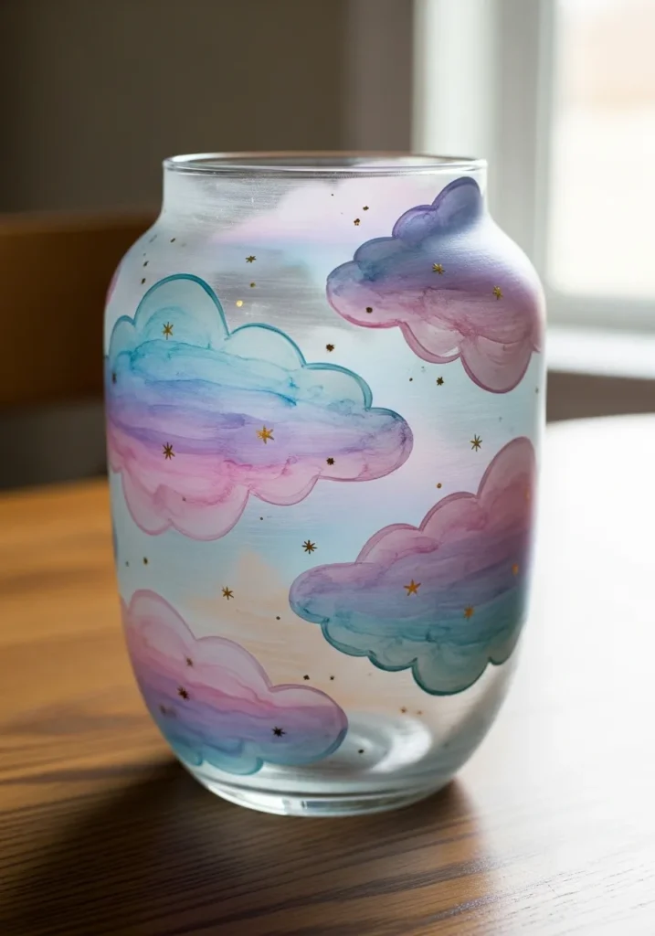 This ethereal glass vase features large billowing clouds painted in a stunning watercolor style with blended shades of lavender, blush pink, and soft teal. Each fluffy cloud is defined by a teal outline that gives the design a structured yet dreamy feel against the frosted glass background. To add a bit of magic, tiny metallic gold stars are scattered throughout the sky like sparkling jewelry. The paint has a wonderful translucent quality that lets light pass through the layers of color, creating a soft and glowing effect that feels like a sunset captured in a jar.