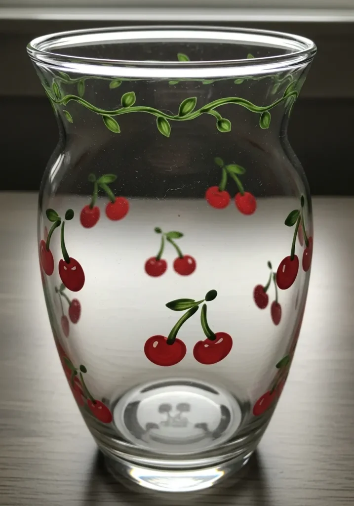 I find this specific design so refreshing because it proves that you don’t need a complicated pattern to make a huge impact. It is a fantastic project for a quick afternoon craft session since the cherries are basically just perfectly placed dots, and the vine at the top is very easy to freehand. If you love that classic farmhouse kitchen aesthetic, then this cherry motif will fit right in with your decor. It would look absolutely stunning holding some fresh white hydrangeas or even sitting empty on a sunny kitchen shelf.