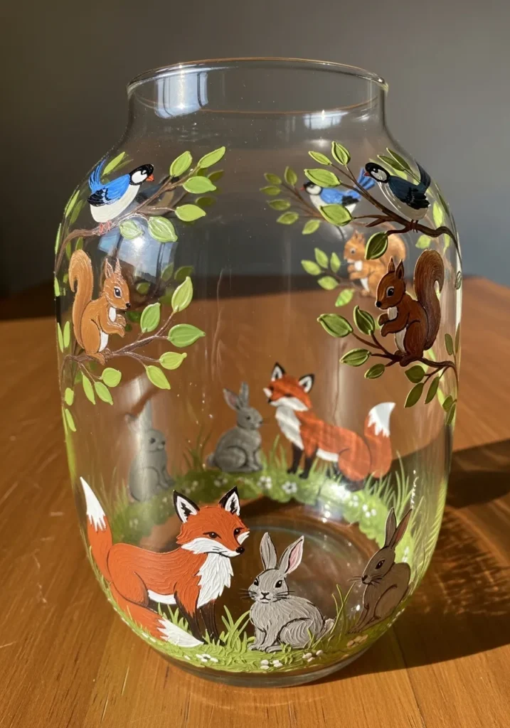 This stunning glass jar features a detailed wrap-around illustration of a bustling forest scene that looks like something out of a classic storybook. Rusty orange foxes with fluffy white-tipped tails and chests lounge on a bed of vibrant green grass at the base, while grey and brown bunnies sit nearby with twitchy pink noses. Further up, the glass winding brown branches are filled with lime green leaves and hold perky squirrels with bushy tails, along with little blue and black birds. The paint is applied with visible textures that give the animals a fuzzy appearance, and the clear background lets you see the whole community hanging out together through the vase.