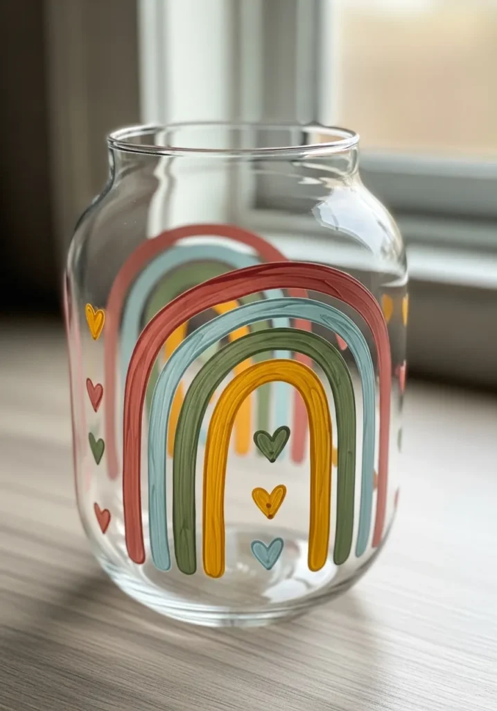 This adorable clear glass jar features a large hand-painted rainbow in a trendy boho color palette of terracotta, sage green, mustard yellow, and dusty blue. The rainbow arches are painted with a lovely, thick texture that shows off the individual brushstrokes and gives the design a cool, artisanal vibe. To add a bit more sweetness, tiny colorful hearts are scattered around the main rainbow, which perfectly complements the muted tones. The transparent glass keeps everything looking modern and clean, so those beautiful, earthy colors can really take center stage on your shelf.