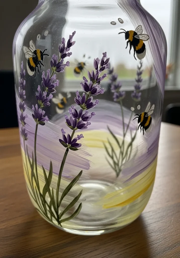 This charming glass jar features a beautiful, tall lavender design that feels like a fragrant summer afternoon. Long, elegant stems of deep purple lavender buds stretch upward and showcase a wonderful layered texture that makes each little flower spike look three-dimensional. Large fuzzy bumblebees with iconic black and yellow stripes and delicate white wings are scattered around the glass as if they are mid-flight. The background is enhanced with broad sweeping strokes of soft violet and buttery yellow paint, which create a dreamy sunset glow that remains semi-transparent on the smooth glass surface.