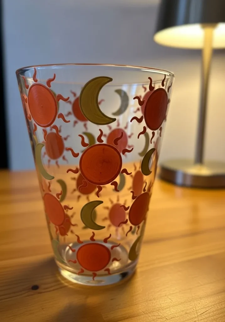 This flared glass vase features a striking celestial pattern that balances warm energy with a touch of mystery. Bold terracotta suns with playful wavy rays are scattered across the clear surface and paired with slender crescent moons in a muted olive gold. The paint is applied in concentric circular strokes on the suns, which gives them a cool, textured look that catches the light beautifully. Everything is perfectly spaced out to create a cohesive pattern that wraps around the entire vessel and leaves plenty of transparent space to showcase whatever gorgeous stems you decide to pop inside.