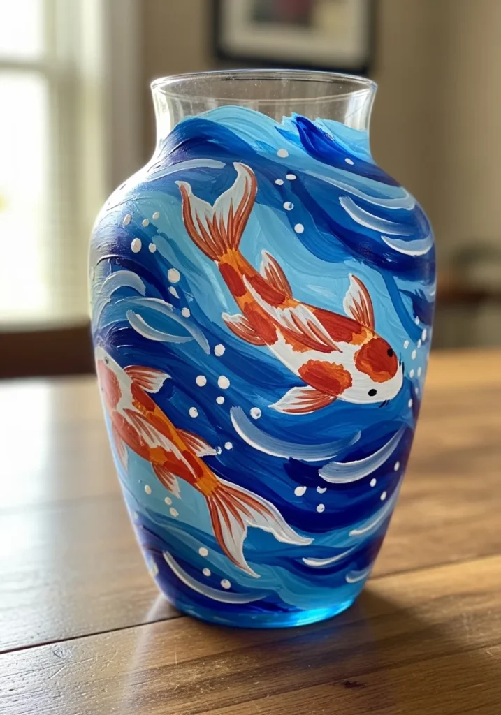 This breathtaking vase captures the fluid beauty of a serene koi pond with its vibrant and energetic design. Elegant orange and white koi fish glide through swirling currents of deep sapphire and bright azure water. The thick and textured brushstrokes give the water a real sense of motion while tiny white bubbles add a playful touch of realism to the scene. Each fish is painted with intricate scaling and flowing fins that stand out brilliantly against the rich blue background, creating a high-contrast piece of art that covers the entire glass surface.