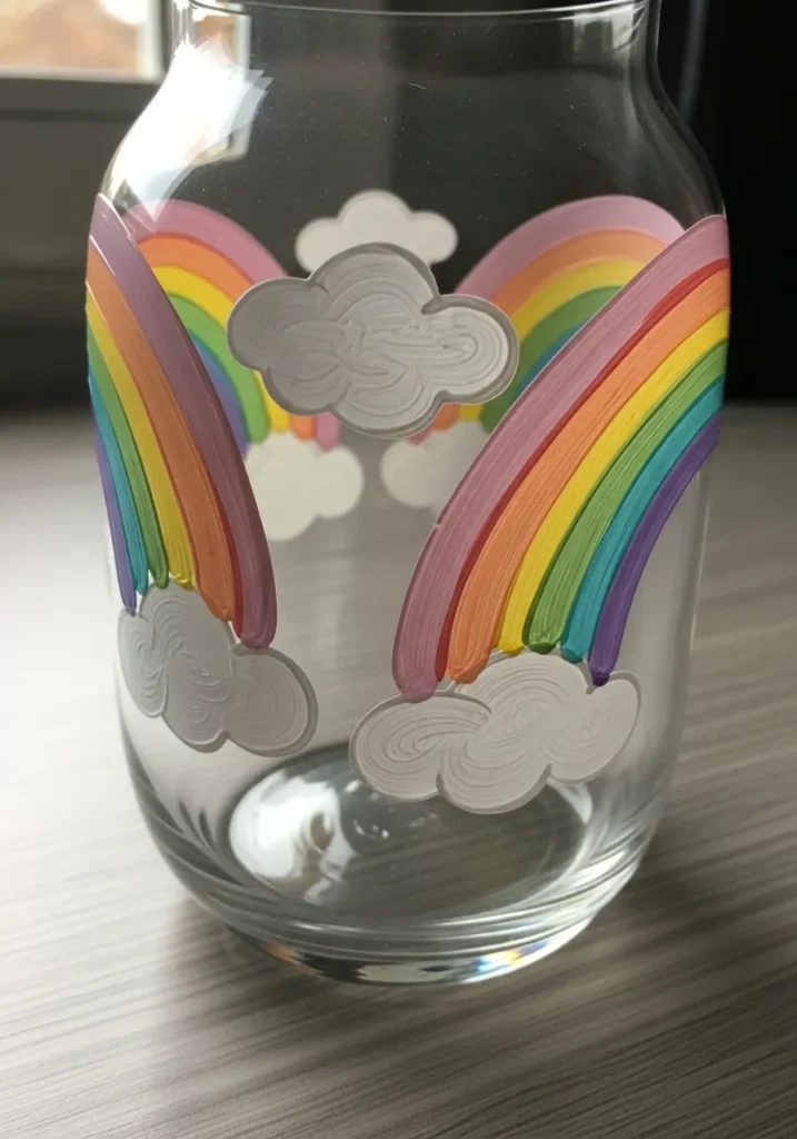 This clear glass jar is the definition of pure joy with its vibrant and cheerful rainbow motif. Two large and thick arches of color stretch across the glass and feature a classic spectrum of red, orange, yellow, green, and blue. The paint is applied with a heavy and textured stroke that gives the rainbows a wonderful 3D effect, while the fluffy white clouds at the base of each arch are filled in with swirling circular motions for a soft and billowy look. Everything is set against the perfectly transparent glass, which makes the bold primary colors look like they are floating in mid-air.