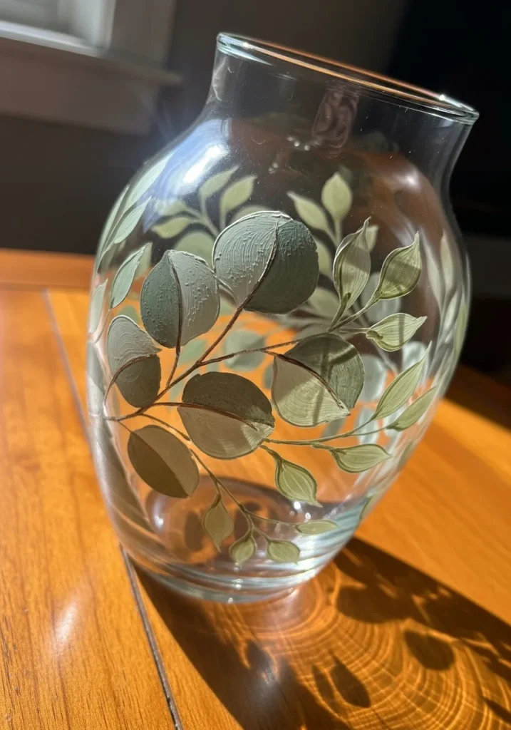 This elegant glass vase features a sophisticated botanical design with layers of sage green and pale olive leaves. The artist used a dry brush technique to create a beautiful ribbed texture on the larger eucalyptus silver dollar leaves, which gives them a realistic and almost velvety appearance. Delicate thin stems in a slightly darker earth tone connect the various leaf clusters as they wind gracefully around the rounded glass body. The muted monochromatic palette against the transparent glass creates a very calm and high-end look that feels perfectly at home in a modern or minimalist setting.