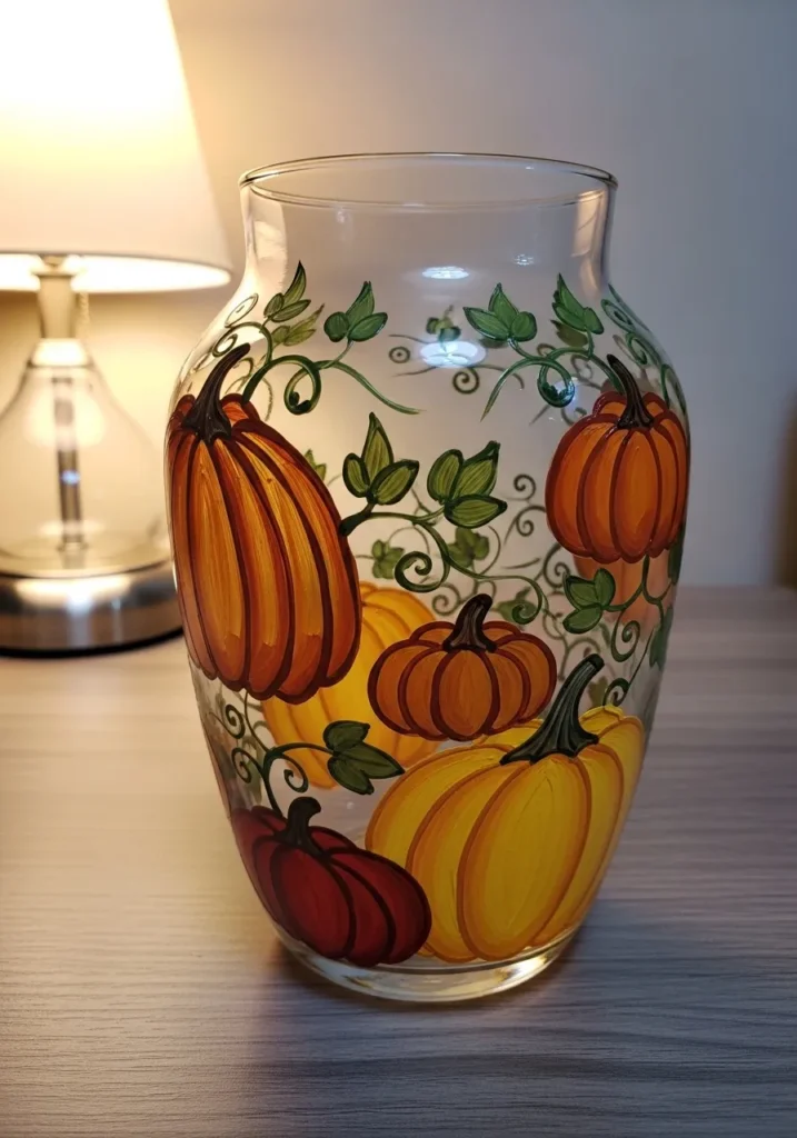 This beautiful glass vessel is ready for sweater weather with its vibrant harvest theme. Hand-painted pumpkins in various shades of burnt orange, golden yellow, and deep brick red fill the bottom half of the vase with rich and opaque color. Each gourd features vertical textured lines that highlight its plump ridges, while dark brown stems add a realistic touch. Swirling green vines and delicate pointed leaves wrap around the top portion of the jar and create a sense of movement that connects all the pumpkins together in a cozy garden scene.