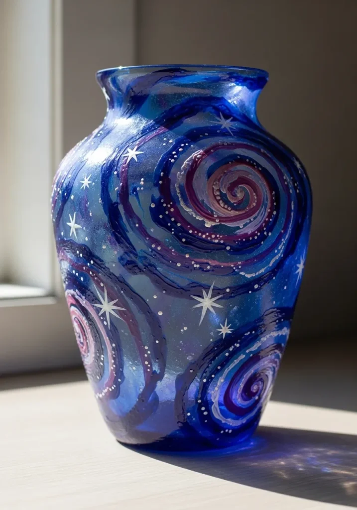 This breathtaking glass vase is a deep-blue tribute to the wonders of the cosmos. Swirls of rich indigo, royal blue, and violet paint wrap around the vessel in thick, impasto-style strokes that create a sense of infinite motion. At the center of these cosmic whirlpools are delicate spirals of white and soft pink, mimicking distant galaxies. To finish the celestial scene, various four-pointed stars and tiny white speckles are scattered throughout, giving the impression of a shimmering starlit sky that glows when the light hits the translucent glass.