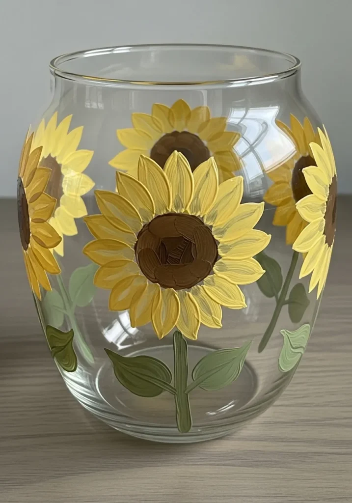 This cheerful glass vase captures the essence of a late summer afternoon with its bold and bright sunflower design. Large, vibrant yellow sunflowers wrap around the rounded vessel, each featuring a thick, chocolate-brown center with a visible swirling texture that mimics the look of real seeds. The petals are applied with confident, layered brushstrokes in various shades of buttery yellow and gold, giving the flowers a beautiful sense of depth and dimension. Sturdy sage green stems and broad, slightly curved leaves at the base ground the design, all set against a crystal-clear background that lets the sunny colors truly pop.