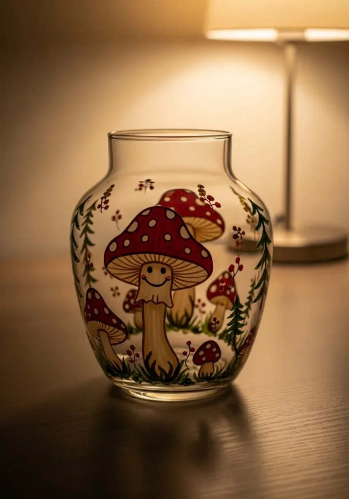 This whimsical clear glass vase transports you straight into a fairytale with its adorable toadstool illustrations. The design features several red mushrooms with classic white spots and some even have little smiling faces tucked under their caps for an extra dose of personality. Deep green ferns and tiny red berries frame the scene while the textured tan stems give the mushrooms a grounded and earthy feel. Everything is painted with clean outlines and vibrant colors that make the woodland theme stand out beautifully against the transparent glass.