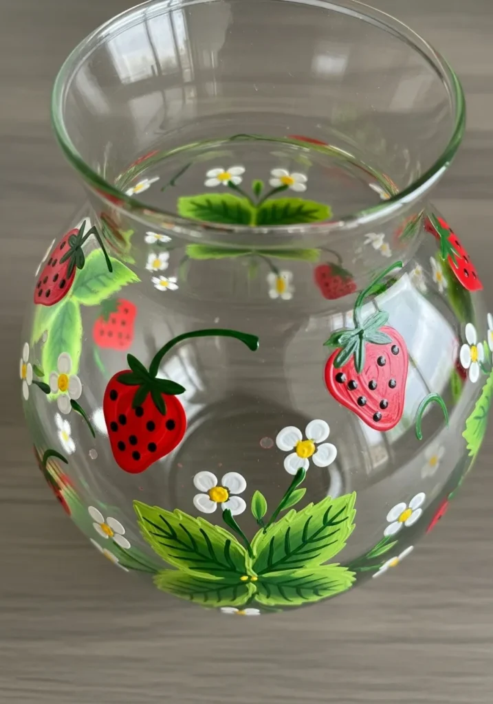 This round glass fishbowl vase is transformed into a fruity masterpiece with a vibrant strawberry vine design. Bright candy red berries with tiny black seeds are scattered across the glass and accompanied by lush green leaves that feature darker veining for a realistic touch. Dainty white blossoms with sunny yellow centers add a fresh floral element while delicate green tendrils curve around the smooth surface. The clear glass base allows the rich reds and greens to pop beautifully and creates a playful 3D effect as the design wraps around the curves of the bowl.
