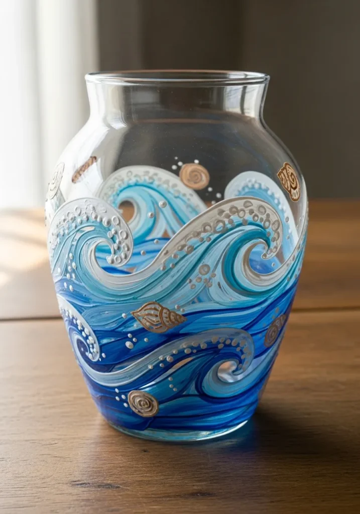 This stunning glass vase brings the soothing energy of the shoreline right into your home with its dynamic aquatic scene. Swirling crests of cobalt, turquoise, and crisp white paint wrap around the base to create the look of crashing surf. The artist used a heavy-handed layering technique that builds up a tactile, foamy texture on the tips of the waves, making them look like they are actually splashing. To finish the seaside story, little golden seashells and tiny white bubbles are peppered throughout the design, adding a sophisticated glimmer against the deep blue water.