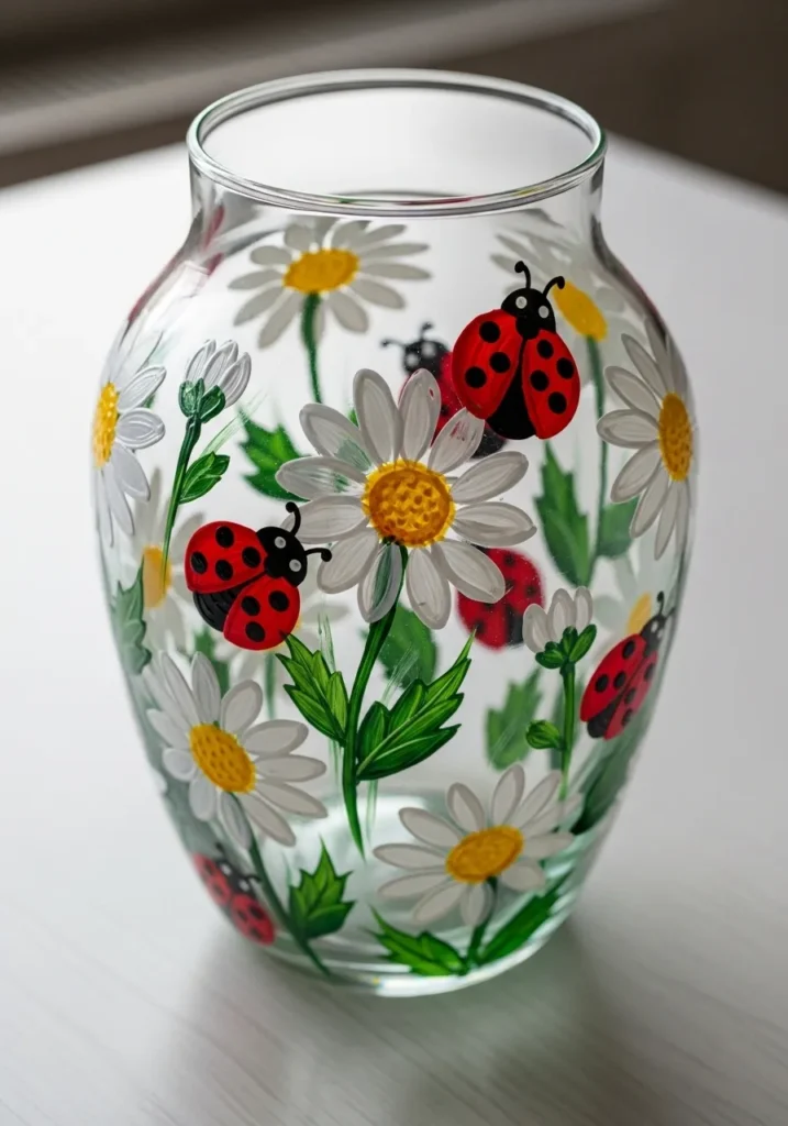 This charming glass vessel is absolutely crawling with cuteness thanks to a vibrant ladybug and daisy theme. Large crisp white daisies with sunny textured yellow centers wrap around the glass and sit atop bright lime green stems with jagged leafy details. Several plump red ladybugs with shiny black spots and tiny antennae are tucked among the petals and give the design a wonderful sense of movement. The paint is applied with a lovely opaque finish that makes the colors pop against the clear background, while the smooth glass keeps the overall look fresh and modern.