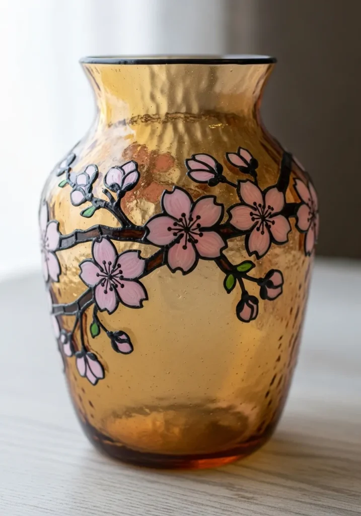 This stunning amber glass vase features hand-painted cherry blossoms that look like they are floating on a warm sunset. The delicate pink petals are outlined with thick black leading, which creates a beautiful 3D effect against the textured honey-colored glass. Each flower is carefully detailed with tiny stamens and soft shading to give the blossoms a realistic yet artistic feel. The combination of the translucent amber background and the opaque pink paint makes this piece catch the light most invitingly.