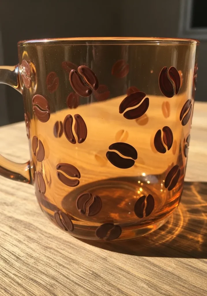 This amber-tinted glass mug features a playful pattern of hand-painted coffee beans scattered across its surface. Each bean is rendered in a rich chocolate brown enamel with a lighter tan highlight to give it a realistic, rounded look. The glossy finish of the paint catches the light beautifully against the warm glow of the transparent glass. It is a perfect example of how a simple repetitive motif can create a sophisticated and modern aesthetic.