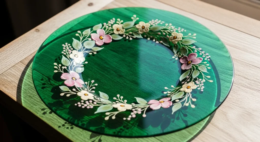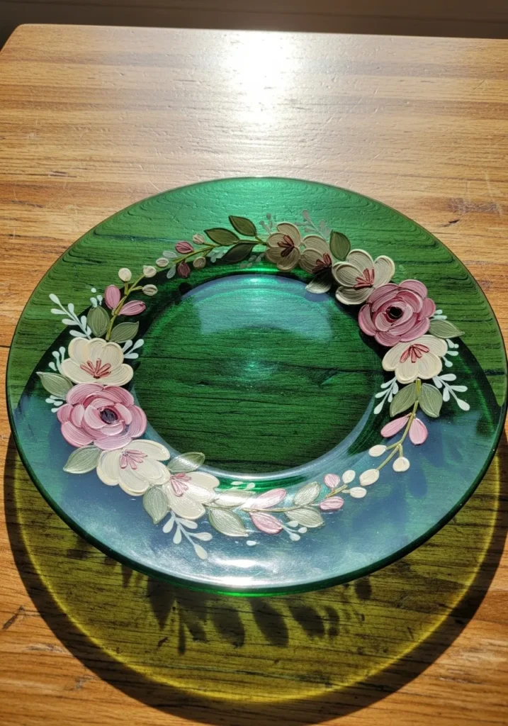 This elegant emerald green glass plate features a delicate hand-painted floral wreath circling the rim. The artist used a one-stroke painting technique to create soft pink roses and creamy white blossoms with intricate petal details. Sage green leaves and tiny white sprigs fill out the arrangement, providing a beautiful natural contrast against the deep jewel-toned glass. The glossy finish of the paint, paired with the translucent green, creates a top-tier artisanal look that feels incredibly sophisticated.