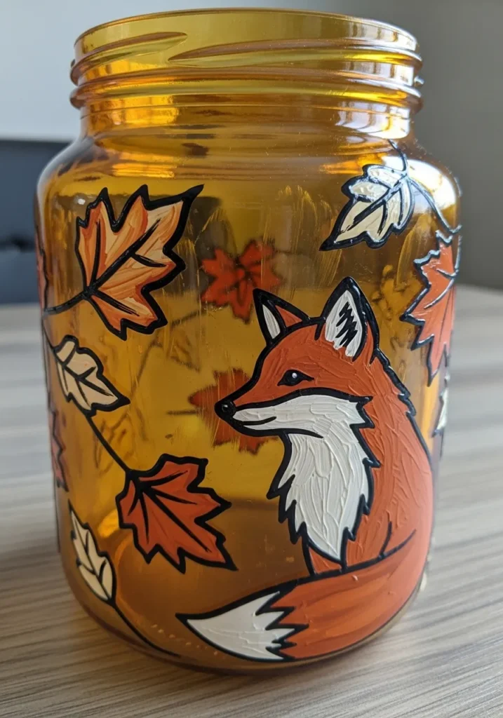 There’s something so fun about decorating for the seasons, and this project brings in those cozy autumn vibes. It is actually quite easy to achieve by using an amber-tinted jar and some opaque glass paints to create your favorite woodland creatures. I am a big believer that you don’t need a fancy canvas when you can turn a simple storage jar into a piece of seasonal art that looks absolutely beautiful on a mantle or kitchen shelf.