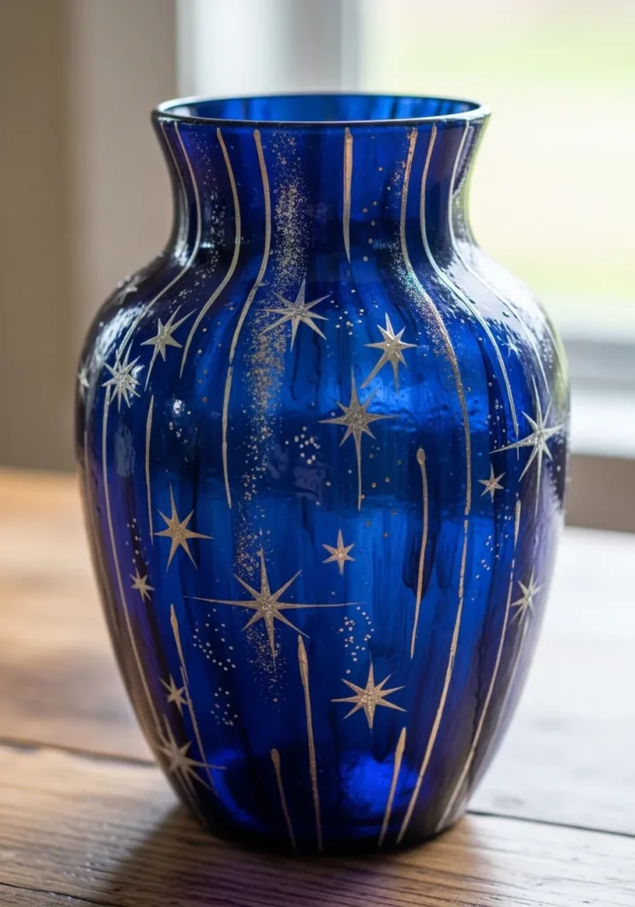 If you’re into a more mystical or celestial aesthetic, this design is a fantastic way to experiment with metallic glass markers or silver leaf. You can easily find a blue glass vessel at a local shop and use a steady hand to add your own constellation patterns and shooting stars. I am always amazed at how a simple bit of silver paint can make a plain vase feel like a high-priced boutique find for your bedroom or vanity.