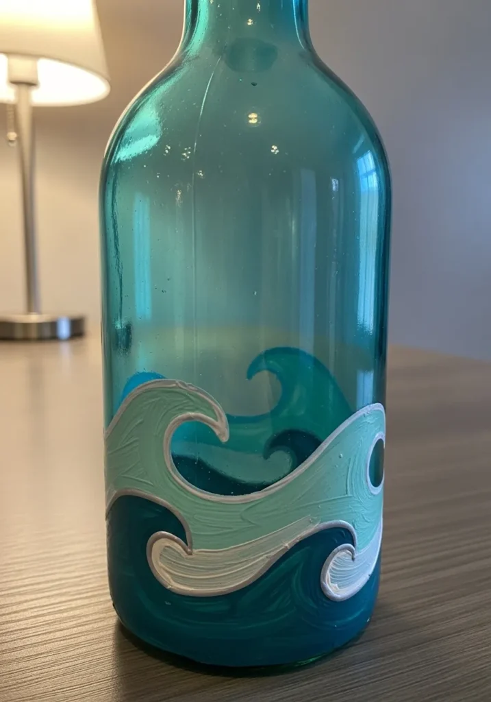 This stunning teal glass bottle highlights stylized ocean waves wrapping around the base. The design uses a mix of mint green and deep sea blue paints with crisp white outlines to define each cresting wave. Thick brushwork gives the water a tactile quality that mimics the movement of the sea against the smooth translucent glass. It brings such a fresh and coastal energy to any tabletop or shelf.