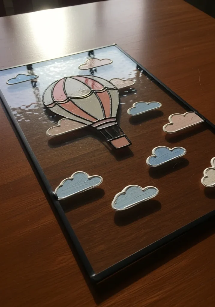 This whimsical glass panel showcases a charming hot air balloon drifting through a scattered sky of soft clouds. The balloon is designed with elegant vertical stripes in dusty pink, cream, and muted gray, all defined by raised silver leading that gives the piece a classic stained glass texture. Surrounding the balloon are several puffy clouds in matching pastel blue and pink tones, each outlined with the same metallic finish to create a cohesive and dreamy look. The entire scene is set within a sleek black frame that makes the delicate colors of the painted glass really stand out.