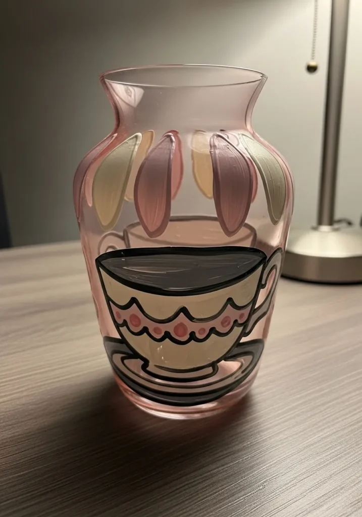 This whimsical pink glass vase has a playful hand-painted design that is perfect for a cozy kitchen or breakfast nook. A charming cream-colored teacup sits at the base, detailed with a scalloped pink pattern and filled with a dark coffee or tea tone. Encircling the neck of the vase are soft, teardrop-shaped petals in alternating shades of pastel pink, yellow, and mint green. Bold black outlines provide a stained glass look, while the translucent rosy glass of the vase itself adds a gentle, feminine glow to the entire piece.