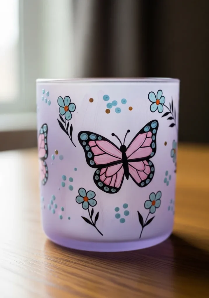 This dainty frosted lavender glass holder is decorated with a beautiful pink butterfly at its center. The wings feature fine black veining and blue dot accents, while small light blue flowers with orange centers and black leaves dance around the rest of the surface. Tiny blue and gold dots are sprinkled throughout the background like confetti or magical pollen. The smooth matte texture of the frosted glass makes the vibrant enamel paints look incredibly soft and feminine.