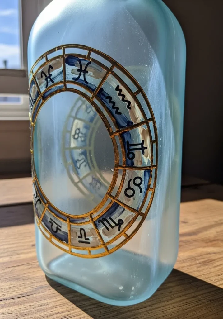 This unique bottle shows a frosted, sea-glass finish that provides a misty blue backdrop for a sophisticated golden zodiac wheel. The wheel is intricately divided into twelve segments using raised gold leafing, which perfectly mimics the look of a vintage astronomical instrument. Each segment is filled with a wash of translucent blue and white paint, topped with a hand-drawn black astrological symbol. The way the light passes through the frosted surface softens the colors while making the metallic gold outlines shimmer beautifully.