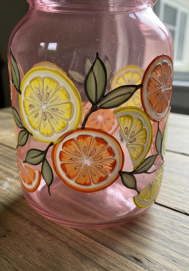This cheerful pink glass jar is decorated with vibrant hand-painted slices of lemons and oranges. Each fruit segment features thick white pith lines and sunny yellow or zesty orange pulp details with dark outlines for extra pop. Muted green leaves are scattered between the citrus rounds to create a balanced and organic pattern. The combination of the translucent rosy glass and the opaque fruit designs gives it such a fresh and summery feel.