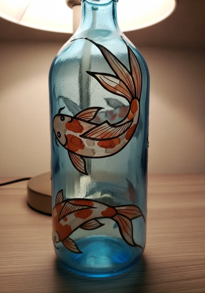 This charming blue glass bottle includes two beautifully painted koi fish swimming in circular motions. The artist used transparent orange and opaque white paints with black outlining to bring the fish to life. The speckled texture in the glass itself resembles tiny bubbles and adds another layer of depth to the aquatic theme. Looking at this upcycled piece is just serene.