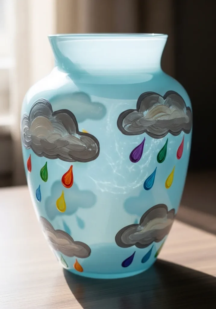 This light-blue frosted vase has a playful and modern take on a rainy day. Several puffy, hand-painted clouds in varying shades of slate and charcoal gray drift across the surface, each finished with a dark outline for a bold pop. Beneath the clouds fall vibrant raindrops in every color of the rainbow, from deep purple and emerald green to sunny yellow and bright red. The matte texture of the sky blue glass creates a soft, hazy background that makes the glossy, colorful paint strokes look like they are floating in mid-air.