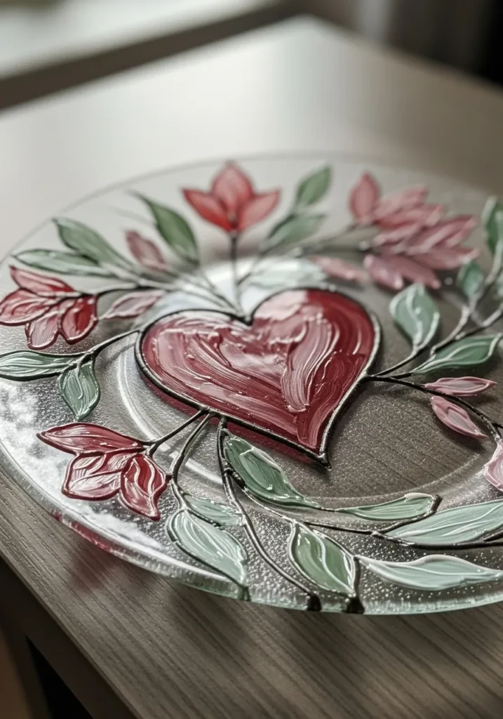 This clear glass plate showcases a bold crimson heart at the center surrounded by a sprawling vine of delicate flowers and sage green leaves. The artist used thick paint strokes to create a raised texture that mimics the look of leaded stained glass. Deep reds and soft pinks blend beautifully within the floral petals, while the black outlines provide a sharp and professional finish. The contrast between the heavy paint and the transparent glass gives this piece a wonderful handcrafted charm.