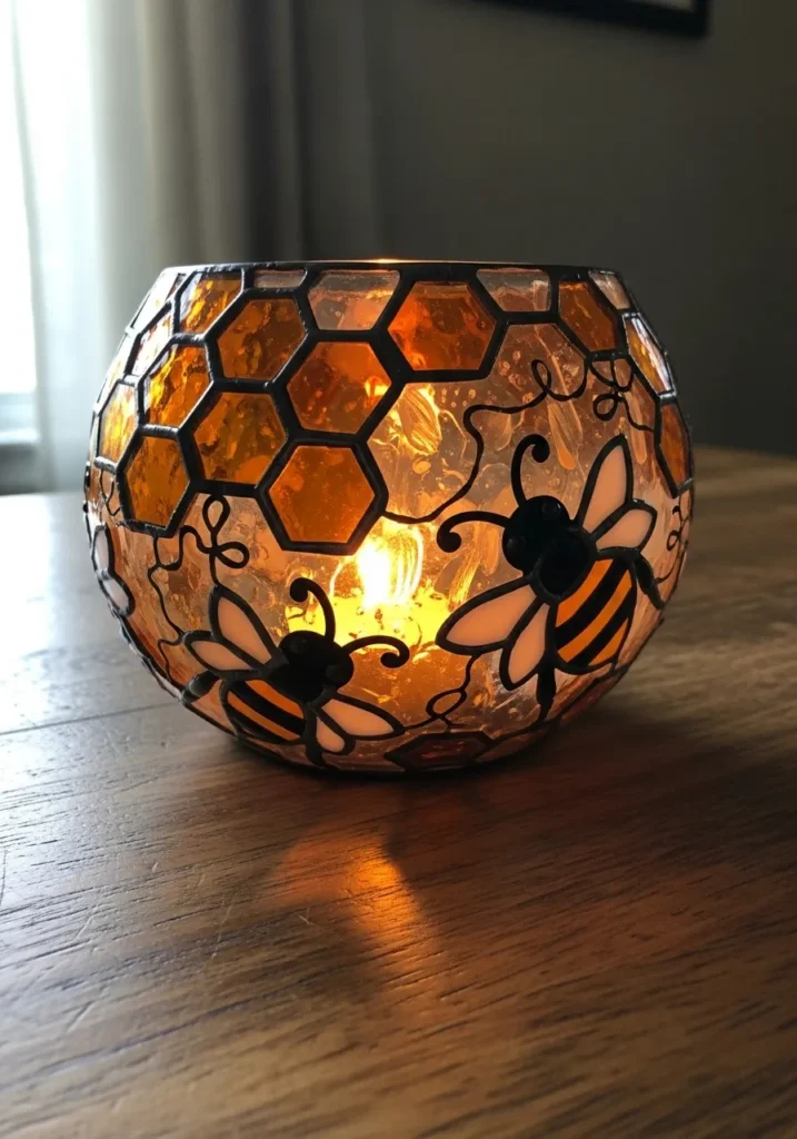 This adorable votive holder uses deep amber glass pieces to create a vibrant honeycomb pattern that wraps around its entire curved surface. Thick black leading separates each hexagon, giving it a true stained glass texture and a lot of definition. It features a couple of cheerful bumblebees with white wings and striped yellow and black bodies made from smaller glass bits. When a little candle is flickering inside, the whole piece just beams with warm, cozy light.