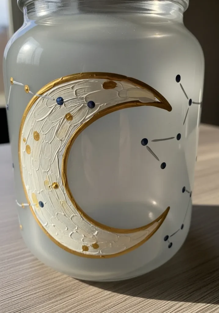 If you are into celestial decor, then this is a total must-try for your next craft night. I am convinced that using a stencil for the moon and a fine-tip paint pen for the stars makes this project achievable even for beginners. It is a fantastic way to turn an old candle jar or mason jar into a glowing piece of nightstand art.