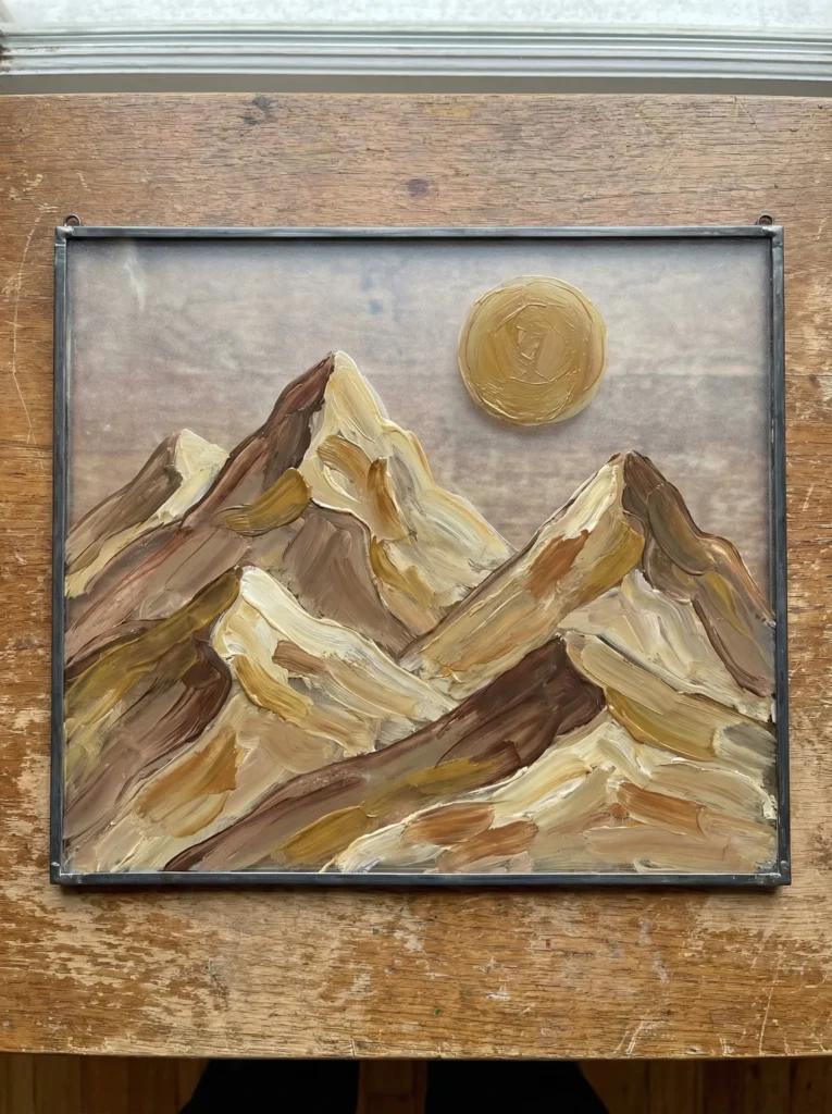 This rustic glass panel captures a serene mountain landscape through a unique painting technique. It displays several rolling peaks made with thick, textured impasto paint strokes in shades of deep brown, ochre, and creamy beige. The sky is a muted, pale lavender tone that lets the light filter through, and a single, raised golden sun shines brightly in the upper corner. All of these painted elements are enclosed within a dark, weathered metal frame with small loops at the top for easy hanging.