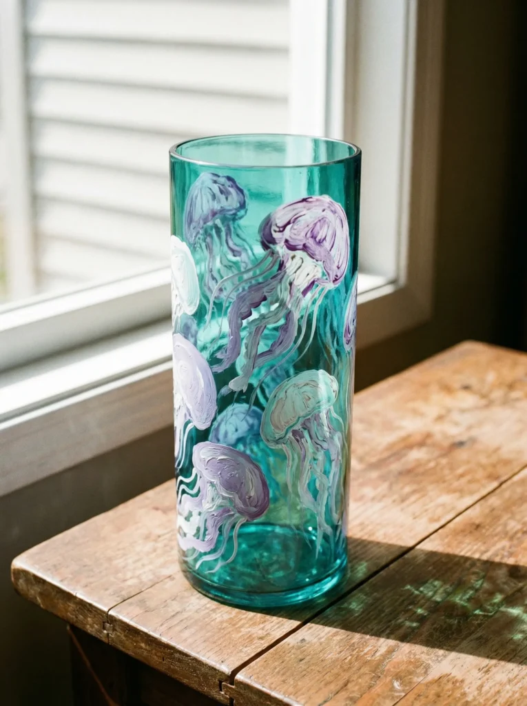 This tall cylinder vase is made from a brilliant teal glass that perfectly mimics the look of a deep tropical ocean. It features several hand-painted jellyfish in dreamy shades of lavender, violet, and crisp white. Each jellyfish has a thick, textured body and long, flowing tentacles that wrap around the glass, giving the whole piece a sense of graceful movement. The way the light passes through the translucent blue glass makes the opaque painted creatures really stand out and glow.