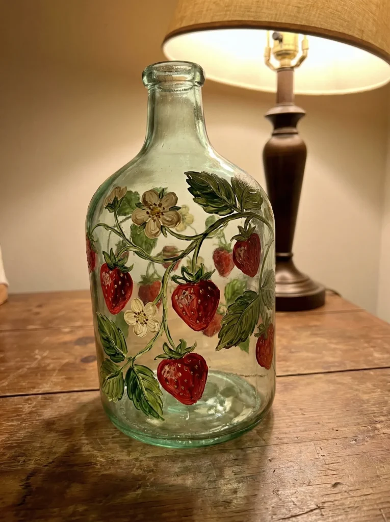 This vintage-style glass jug is adorned with a lush strawberry vine motif that wraps entirely around the clear surface. Deep red berries with tiny white seed details pop against the forest green leaves and delicate cream-colored blossoms. The artist used a layered painting technique to give the foliage a realistic texture and varied shading. It has such a refreshing cottagecore aesthetic that instantly brightens up a room.