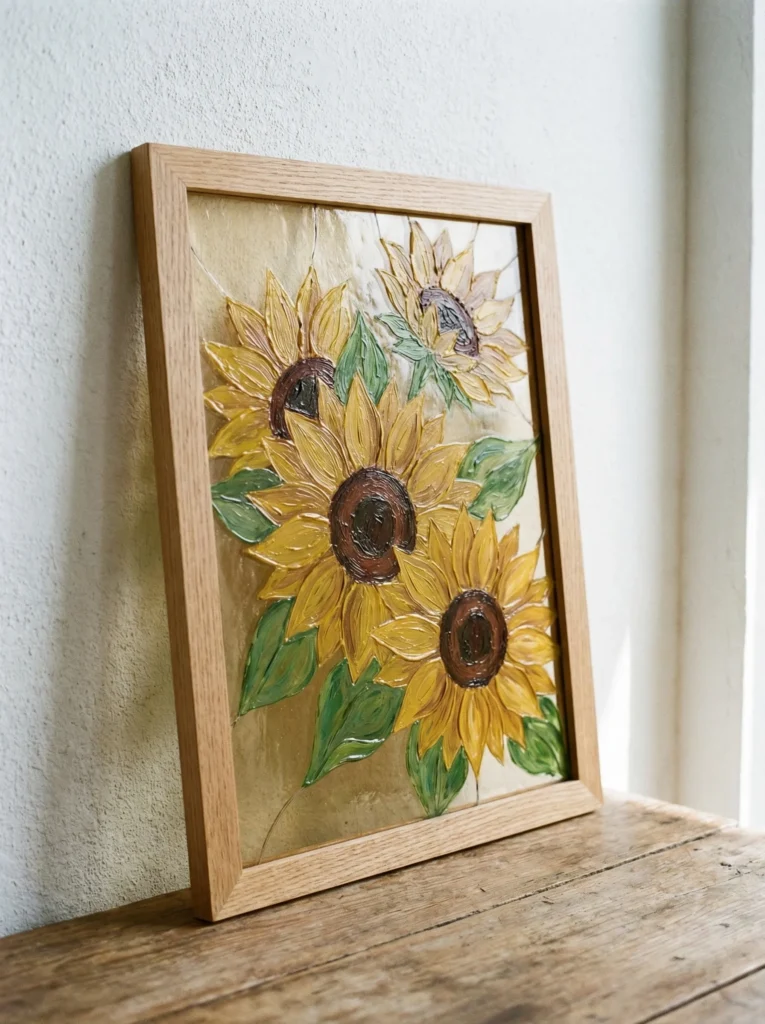This framed pale-yellow glass panel showcases a vibrant cluster of sunflowers that seem to radiate sunshine right off the surface. Each flower is created with thick, textured paint that gives the yellow petals a tactile, three-dimensional look against the translucent gold-tinted background. The deep brown centers of the sunflowers and the rich green leaves are also heavily layered, mimicking the appearance of stained glass through an artistic impasto technique. A simple light wood frame completes the look, making the golden hues pop beautifully when placed near a natural light source.