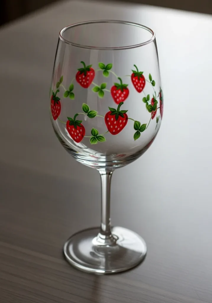 This wine glass features a playful pattern of bright red strawberries with tiny green leaves scattered across the clear surface. Each strawberry is hand painted with glossy red paint and dotted seeds that give the design a charming homemade look. The glass stays mostly transparent which lets the colorful fruit stand out beautifully. The overall feel is fresh, cheerful, and perfect for summer gatherings or a sunny kitchen shelf.