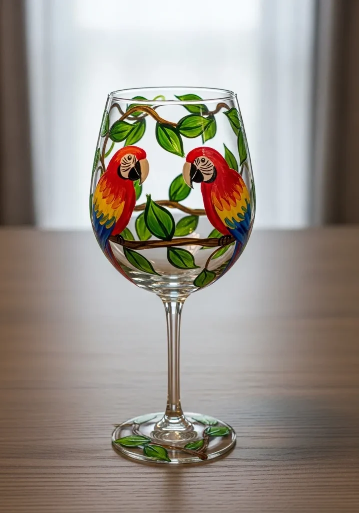 I find tropical themes so fun to paint because the colors can be bold and playful. Even simple bird shapes can look amazing once the bright feathers are added. Painting something like this feels like bringing a bit of vacation energy into a craft project. It turns a plain wine glass into something that feels lively and unique.