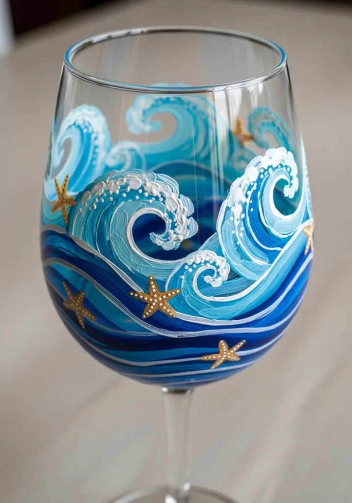 This artistic wine glass features swirling ocean waves painted in layered shades of blue and white. The curved brush strokes create a sense of movement that makes the waves look lively and energetic. Tiny starfish in warm sandy tones are scattered along the lower part of the glass which adds a beach inspired detail. The combination of soft foam lines and deep blue water gives the whole piece a calming seaside look.
