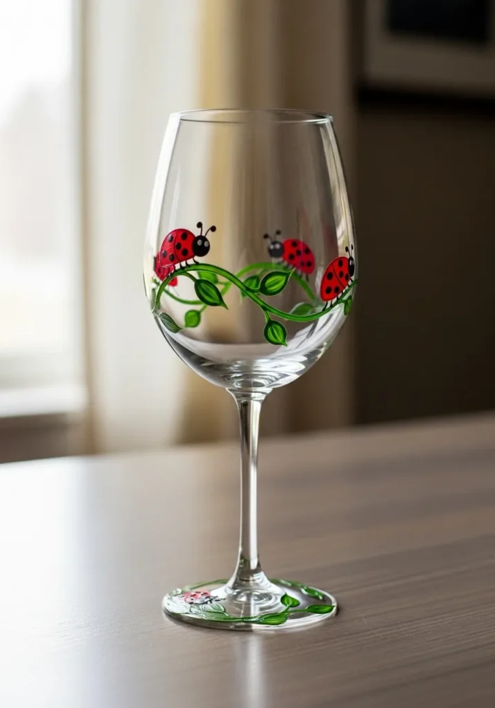 I love how tiny details like ladybugs can make a craft feel charming. The shapes are simple and quick to paint which makes this a great beginner idea. Watching the little bugs appear one by one on the glass feels oddly satisfying. It turns a plain wine glass into something cheerful and handmade.