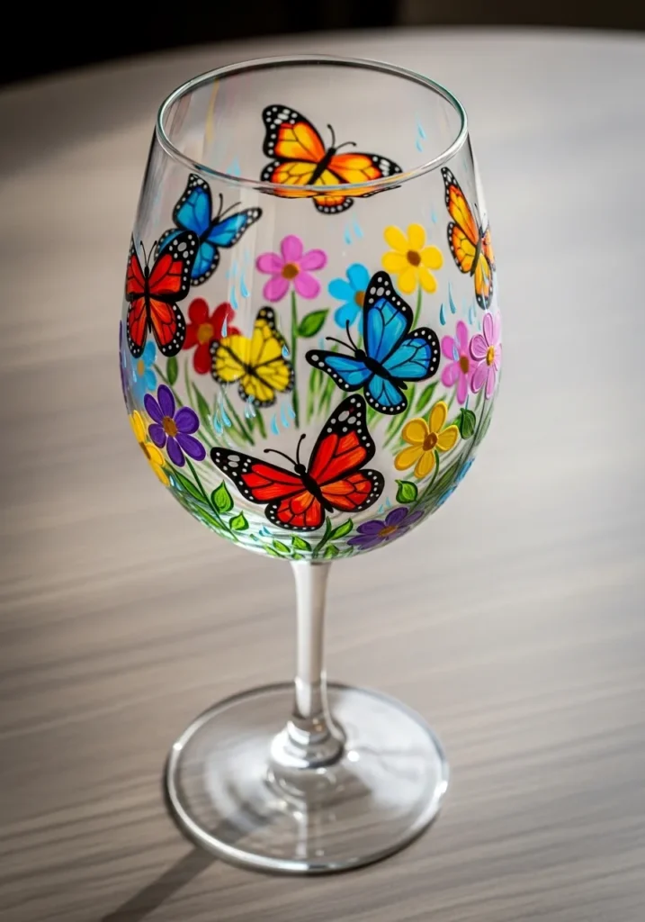 I enjoy crafts that play with transparency like this. A few small butterflies are easy to paint and still look impressive once the glass is filled. It feels like creating a little floating garden scene. This idea is perfect for anyone who wants something pretty but still simple to try on their first painted wine glass.