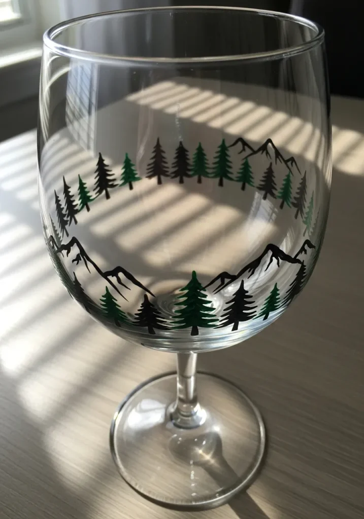 This wine glass features a calm forest scene painted in deep green tones that wrap around the bowl of the glass. Small pine trees form a quiet woodland landscape with gentle hills and a few simple details that give the design depth. The clear glass around the scene keeps the design light and lets sunlight shine through the painted trees.