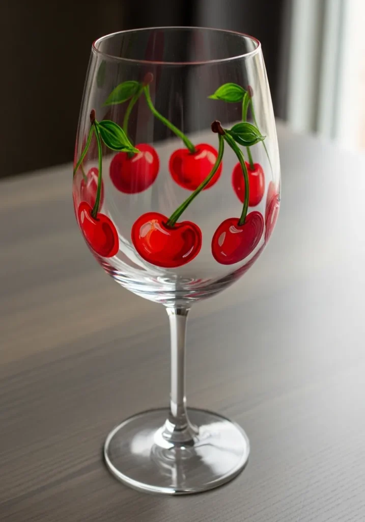 This playful wine glass shows glossy red cherries hanging from delicate green stems that curve around the glass. Each cherry has a bright shine and rounded shape that makes the fruit look juicy and cheerful. Small leaves add fresh green accents which balance the vibrant red color perfectly.