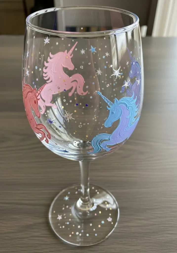 This magical wine glass features soft pastel unicorns painted in pink and blue tones surrounded by tiny white stars. The unicorns appear to float around the glass which gives the design a dreamy storybook feeling. Small sparkling dots add extra detail and make the glass look almost enchanted when light hits it.