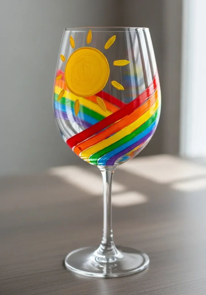 This bright wine glass features a bold rainbow stretching across the glass with a glowing yellow sun shining above it. The rainbow bands are painted in vibrant red, orange, yellow, green, blue, and purple which creates a fun burst of color. Simple sun rays spread outward and make the design feel warm and cheerful.