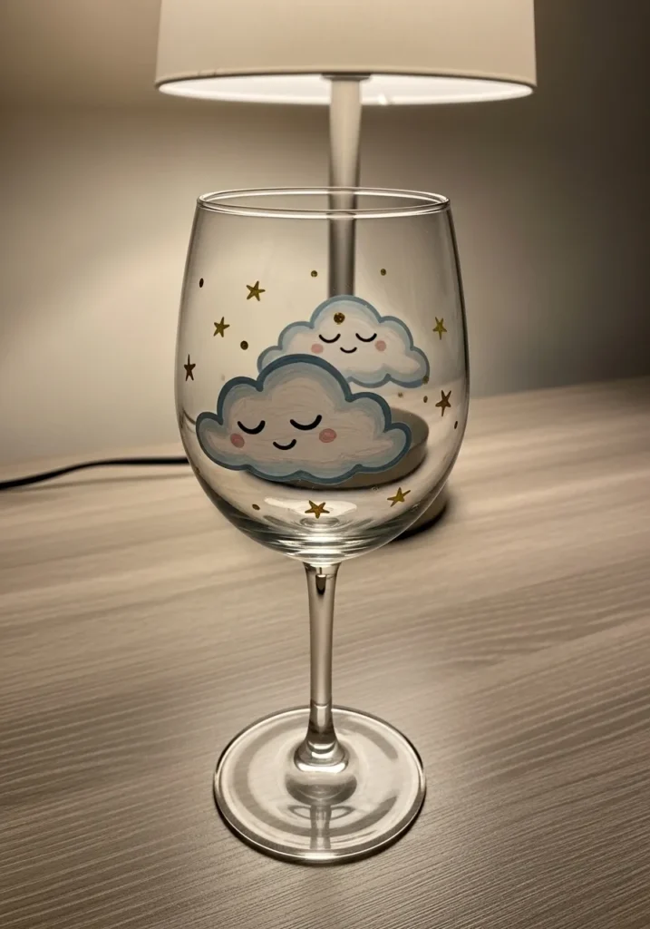 I always find designs like this so relaxing to create. A fluffy cloud shape is easy to paint and does not need perfect lines to look adorable. Adding a tiny face makes the whole glass feel playful and cozy. This is the kind of craft that feels perfect for a calm evening project.