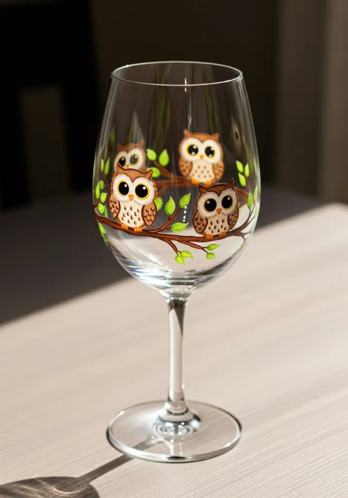 This charming wine glass shows a group of colorful owls sitting among leafy branches near the top of the glass. Each owl has big round eyes and patterned feathers in warm shades of brown orange and cream. Small green leaves and tiny details give the scene a cute woodland feel. The owls form a cheerful little group that wraps gently around the glass.