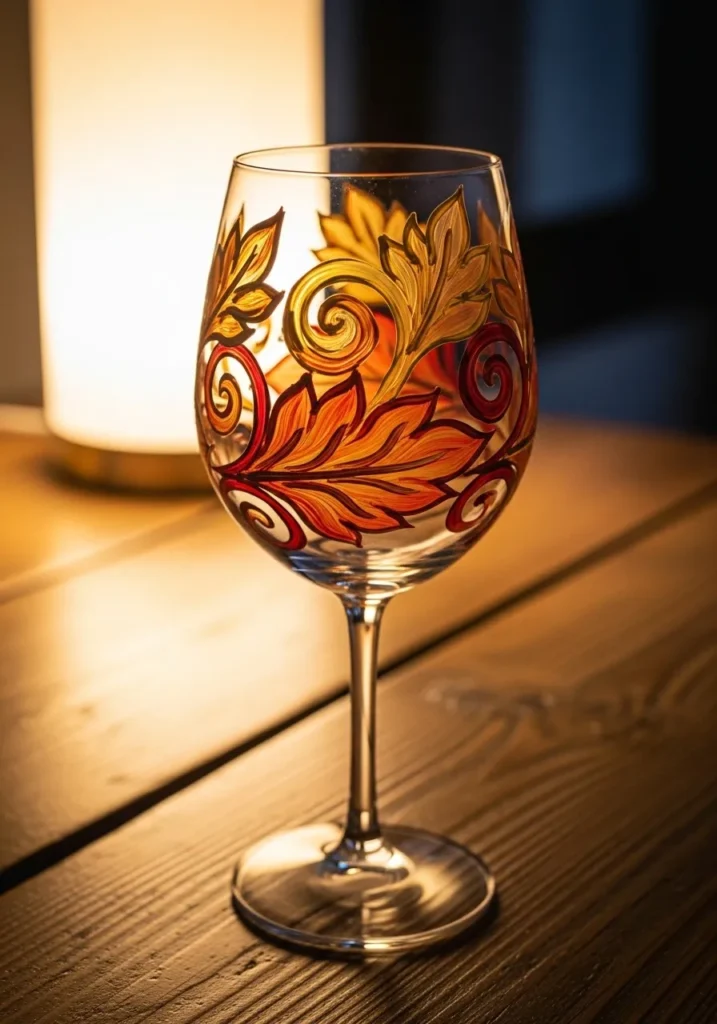 This wine glass is decorated with swirling autumn leaves painted in warm shades of orange red and golden yellow. The leaves curl across the glass with elegant shapes that create a cozy fall inspired pattern. Small details in darker tones add depth which makes the design feel rich and seasonal. The warm colors glow beautifully when light passes through the glass.