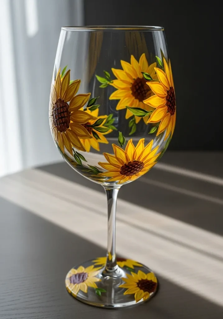 Sunflowers are one of my favorite flowers to paint because they look impressive but are actually very simple. The petal shapes are forgiving and the bold colors make everything pop. I love how quickly this design turns a plain wine glass into something vibrant and happy.