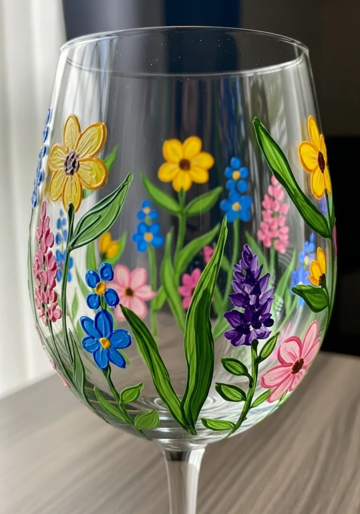 Flower painting is one of my favorite beginner friendly crafts. It does not need perfect lines or strict shapes to look beautiful. I love how a mix of flowers instantly turns a plain wine glass into something joyful and decorative. It feels like capturing a tiny bouquet that never fades.
